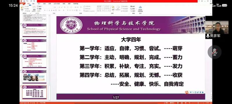 此外,贾彦军副书记着重详细介绍了学校各种处分细则,强调提升学生各方面的安全意识并提出大学四年的规划,希望各位同学顺利度过安全、健康、快乐、自我肯定的大学四年并学有所成。
