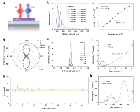 在本研究中,合作者们采用了一种新型NbOCl2材料。它不仅具有常见单层二维材料所特有的大二阶非线性系数,更重要的是它的层间电子耦合弱并且空间结构非对称。这种特性使得它的二阶非线性信号强度会随着二维材料的层数的增加而增加,可超过单层二维材料WS2倍频强度两个数量级以上。