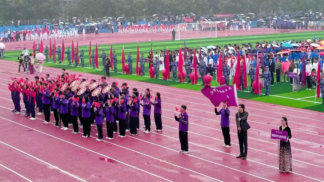 伴随着《运动员进行曲》的激昂旋律,博彩电子游戏推荐 的师生方阵迈着整齐的步伐向主席台走来。同学们高举“电驭梦想,光启未来,磁场汇聚,量子启航”的标语牌,他们热情饱满,斗志昂扬。