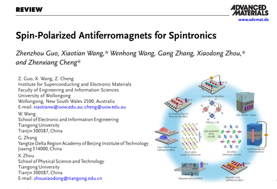 近期,国际材料科学著名期刊《Advanced Materials》(影响因子27.4)在线发表了题为《Spin-Polarized Antiferromagnets for Spintronics》的综述论文,系统总结了自旋极化反铁磁材料在自旋电子学领域的前沿进展与未来发展方向。该论文由天津工业大学王文洪教授团队与澳大利亚伍伦贡大学程振祥教授团队联合完成,其中我院青年教师周小东特聘副研究员与伍伦贡大学王啸天、程振祥教授为共同通讯作者。该研究工作得到了国家重点研发计划物态调控专项“强自旋轨道耦合反铁磁材料物态调控及原型器件”(2022YFA1402600)等项目的有力支持。论文链接://doi.org/10.1002/adma.202505779。