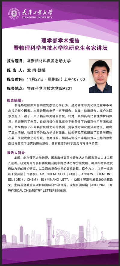 报告人简介:龙闰,北京师范大学教授,国家海外高层次青年人才和国家重大人才工程入选者。研究方向为多自由度耦合的非绝热动力学方法发展、凝聚相材料激发态动力学的理论研究,以及面向复杂体系的智能计算。迄今为止,以第一或通讯(含共同)作者在J. Am. Chem. Soc.(24篇)、Angew. Chem. Int. Ed.(3篇)、Chem(1篇)和Nano Lett. (12篇)等期刊发表200余篇论文;主持基金委重点项目和国际合作项目等。现担任国际期刊Journal of Physical Chemistry Letters副主编。